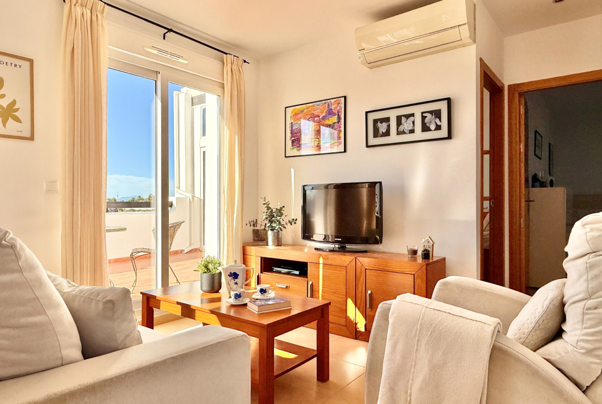 The apartment is sold fully furnished, creating a genuine turnkey opportunity. Air-conditioning units are installed in both bedrooms as well as the living room, ensuring comfort throughout the seasons. The bright and spacious lounge opens through sliding doors to a large south-facing terrace, offering all-day sunshine and an uninterrupted outlook across the 10th fairway. It is the perfect setting for relaxing, dining outdoors, or simply watching golfers walk past as the day unfolds.